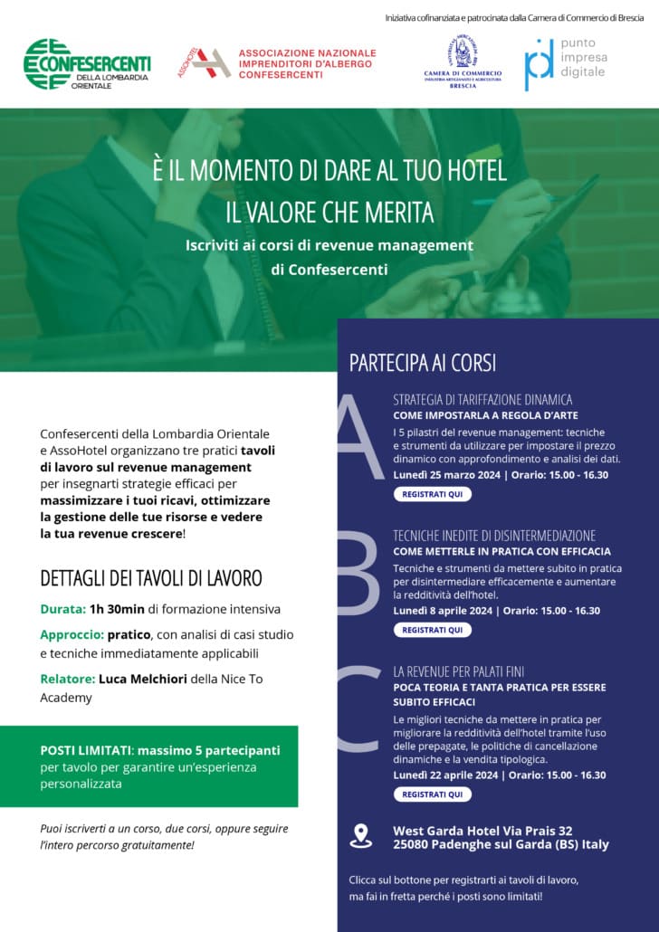 Confesercenti della Lombardia Orientale, in collaborazione con la Nice To Academy e la Camera di Commercio, organizza tre pratici tavoli di lavoro sul revenue management per insegnarti strategie efficaci per massimizzare i tuoi ricavi, ottimizzare la gestione delle tue risorse e vedere la tua revenue crescere!